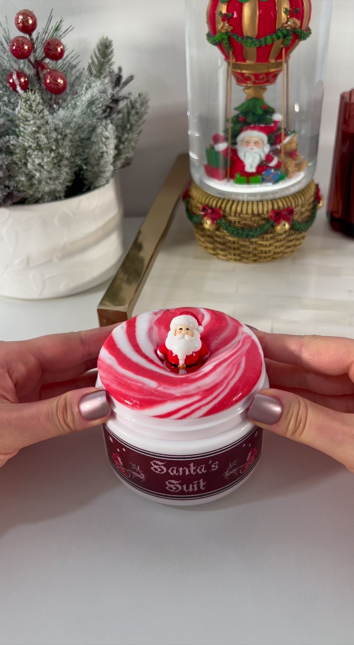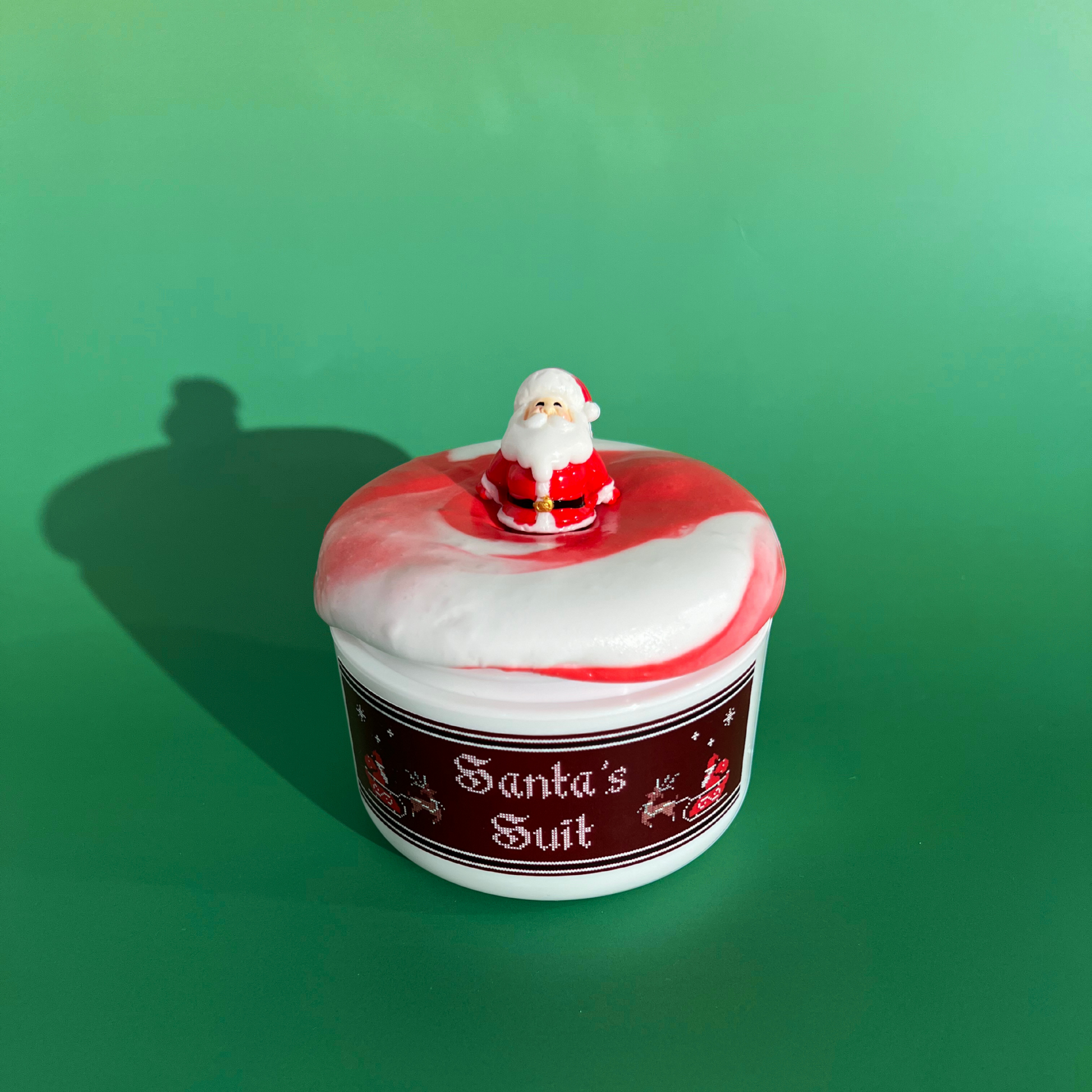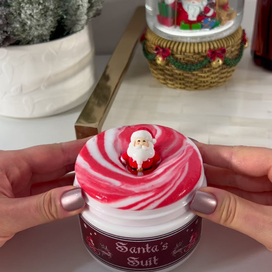 Santa’s Suit is a new soft & chubby snow slay texture that comes with a snow slay base and snow butter topper. The mix of red and white, along with the soft, chubby, and inflating feeling of this slime perfectly capture the qualities of Santa's suit. The texture makes great bubble pops and sizzles, and has huge inflation potential (especially when well-activated). The scent is cozy, clean, and comforting – a blend we created that smells like a well-loved, hand-washed sweater.